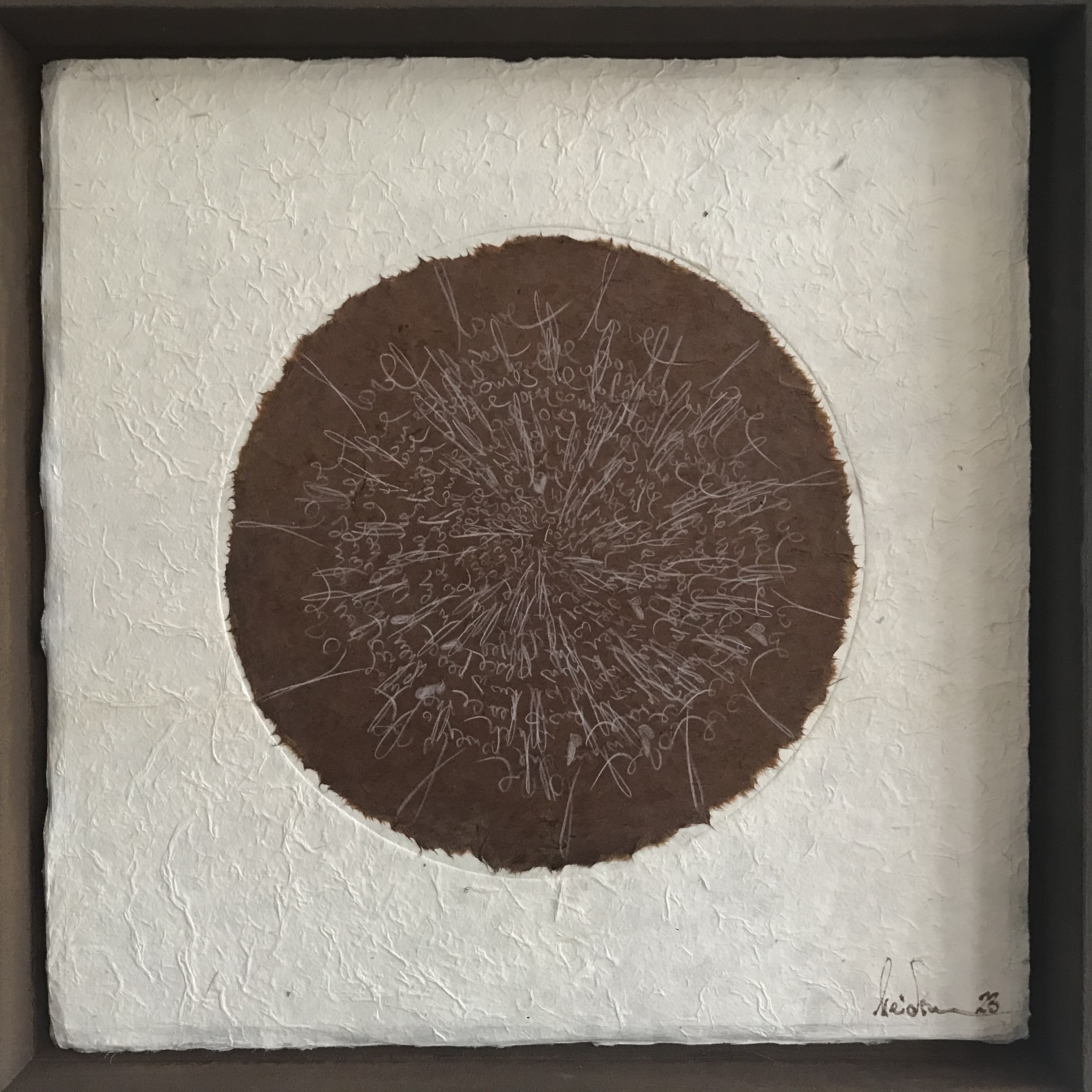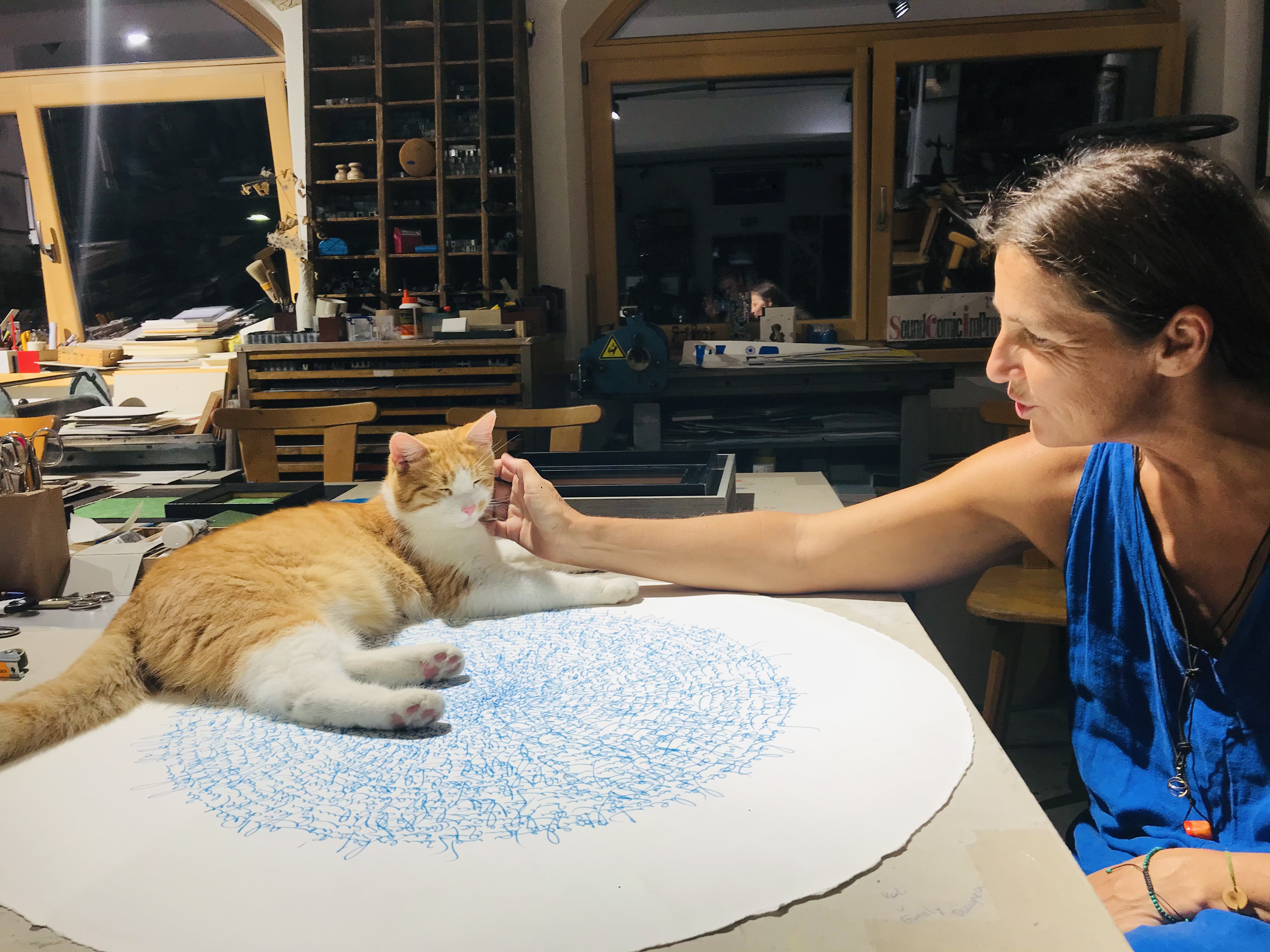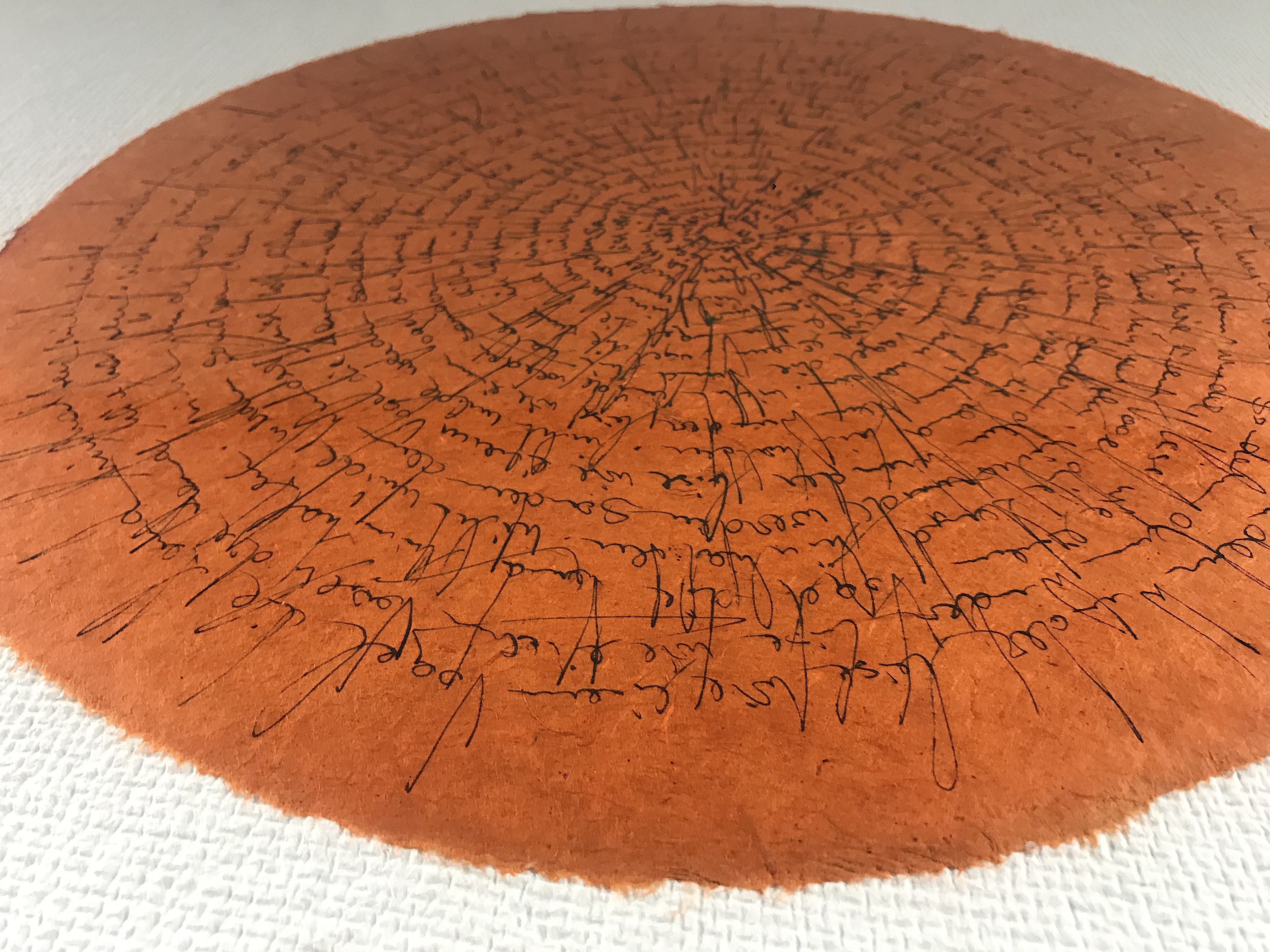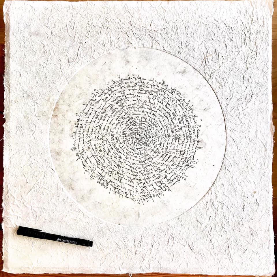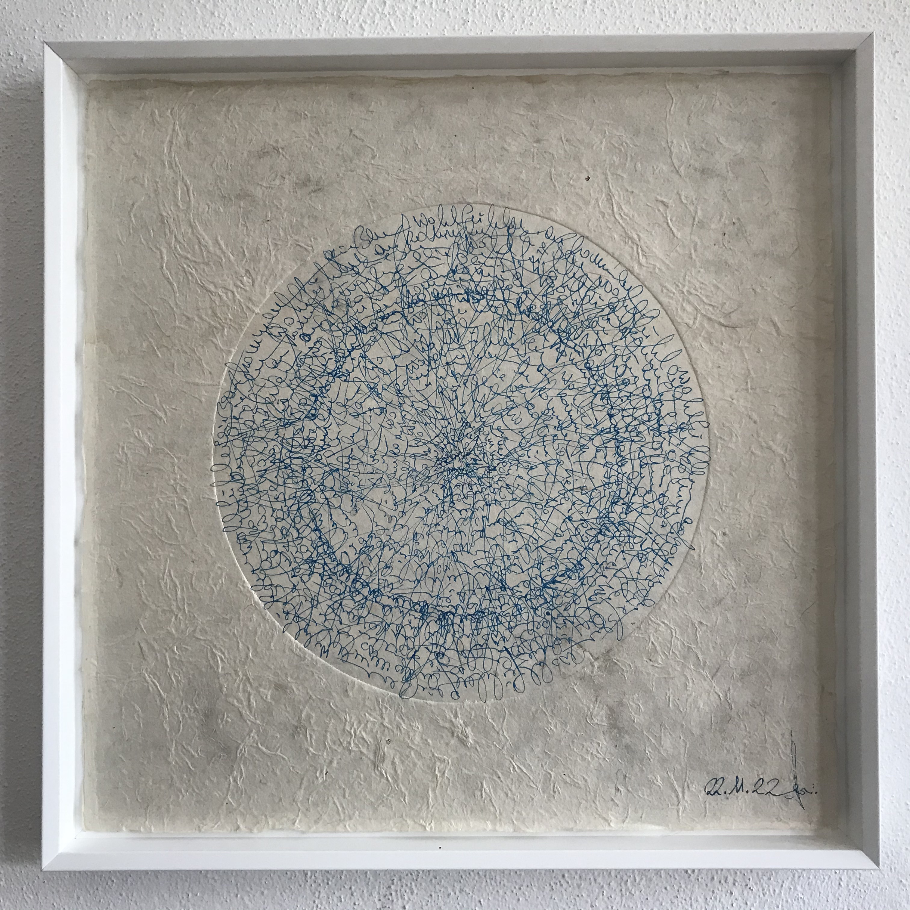 Heidrun wirkt an der Seite von Christian Fuchs in der Buchbinderei Fuchs als Druckwerkstattleiterin und Kreativtrainerin mit Schwerpunkt Malen und Gestalten nach therapeutischen Ansätzen. Durch die Begeisterung zur Handschrift lässt sie ganz besondere Schriftbilder entstehen. Wie ein Mantra wiederholen sich die Worte, bauen ein Energiefeld auf, verschmelzen mit dem handgeschöpften Nepal-Büttenpapier zu einem Gesamt-Kunstwerk. Die sorgfältig ausgesuchten Botschaften/ Gedichte/ Wünsche werden handschriftlich in einen optisch perfekten Kreis geformt - Kreisformen die die Künstlerin schon lange faszinieren.