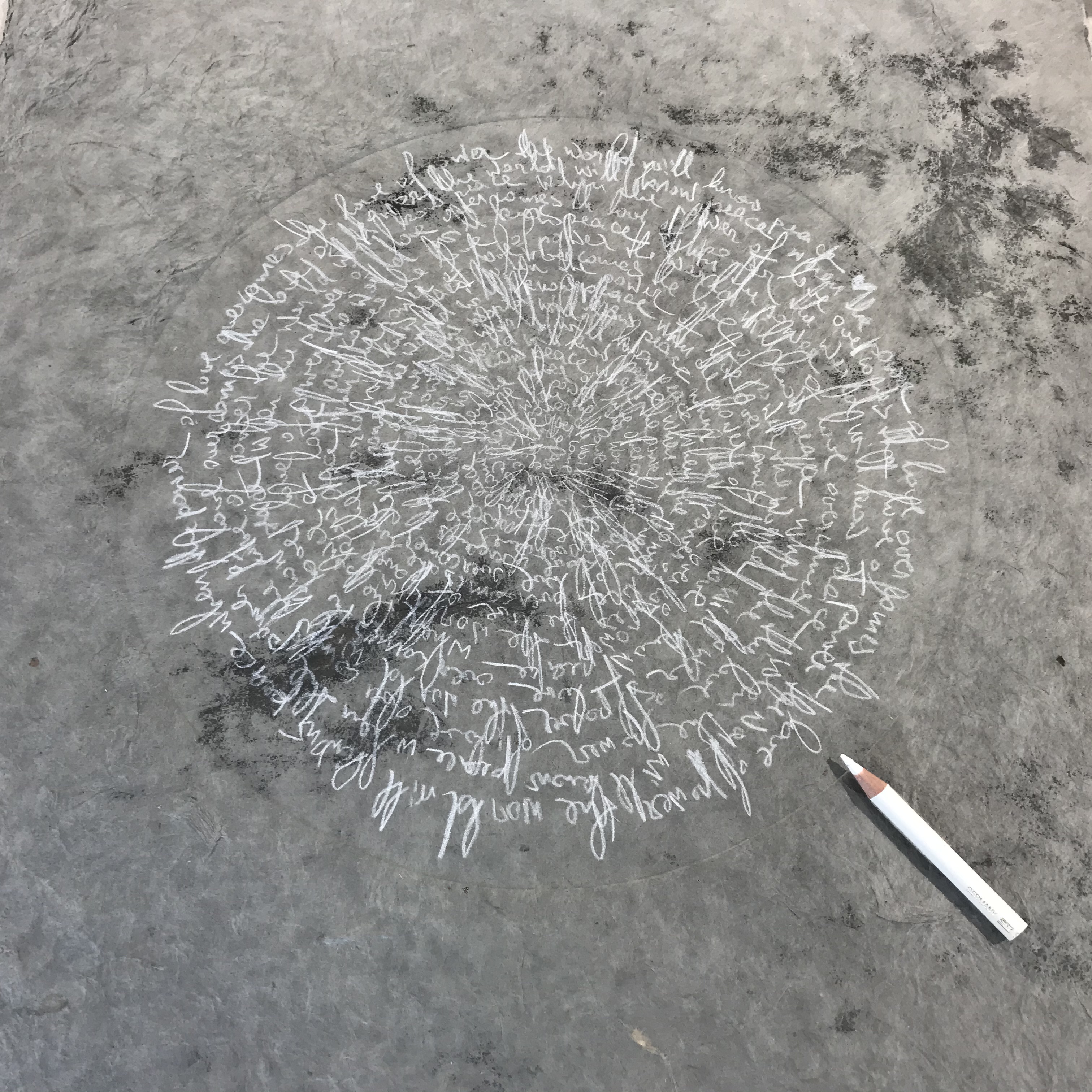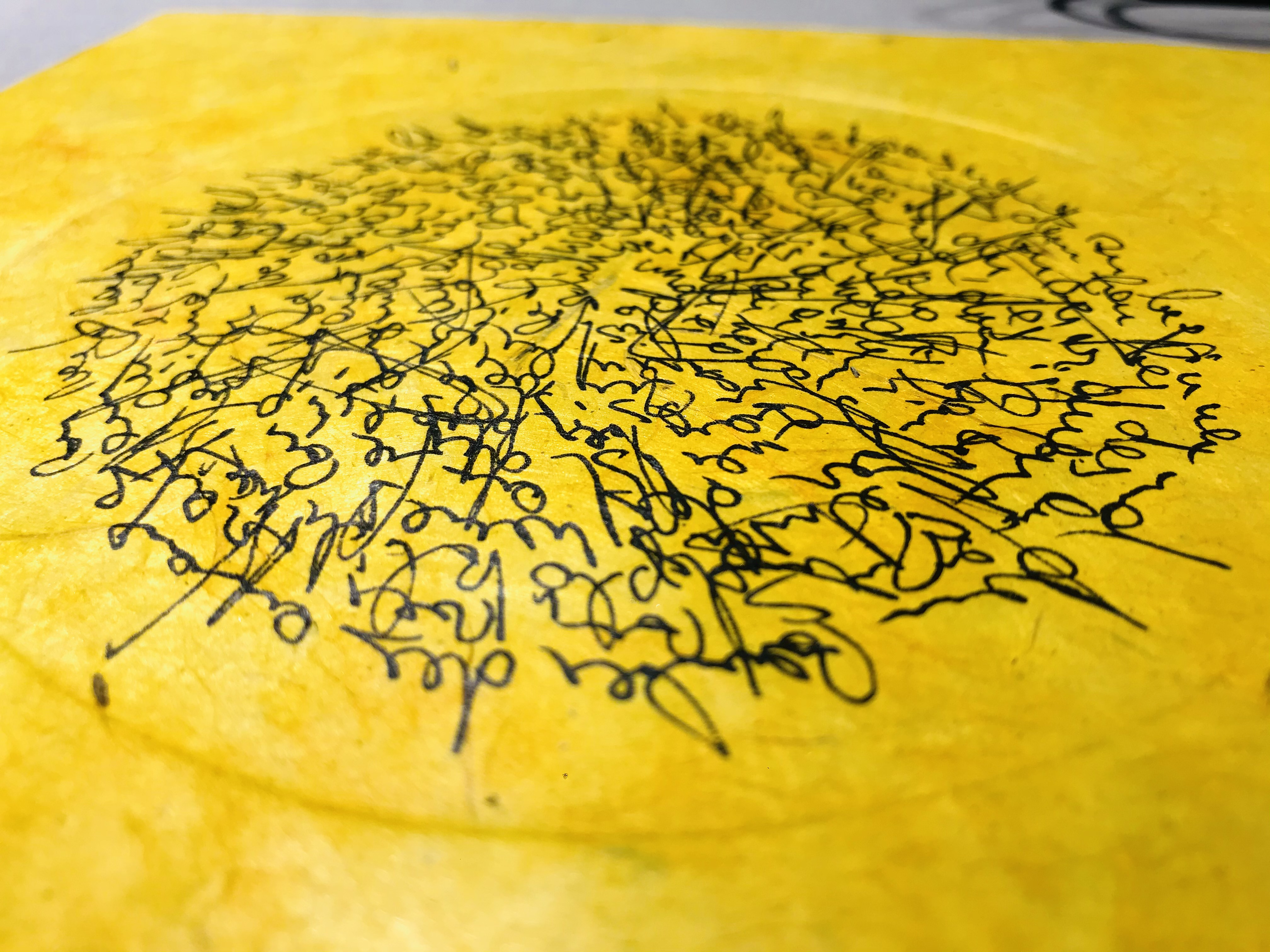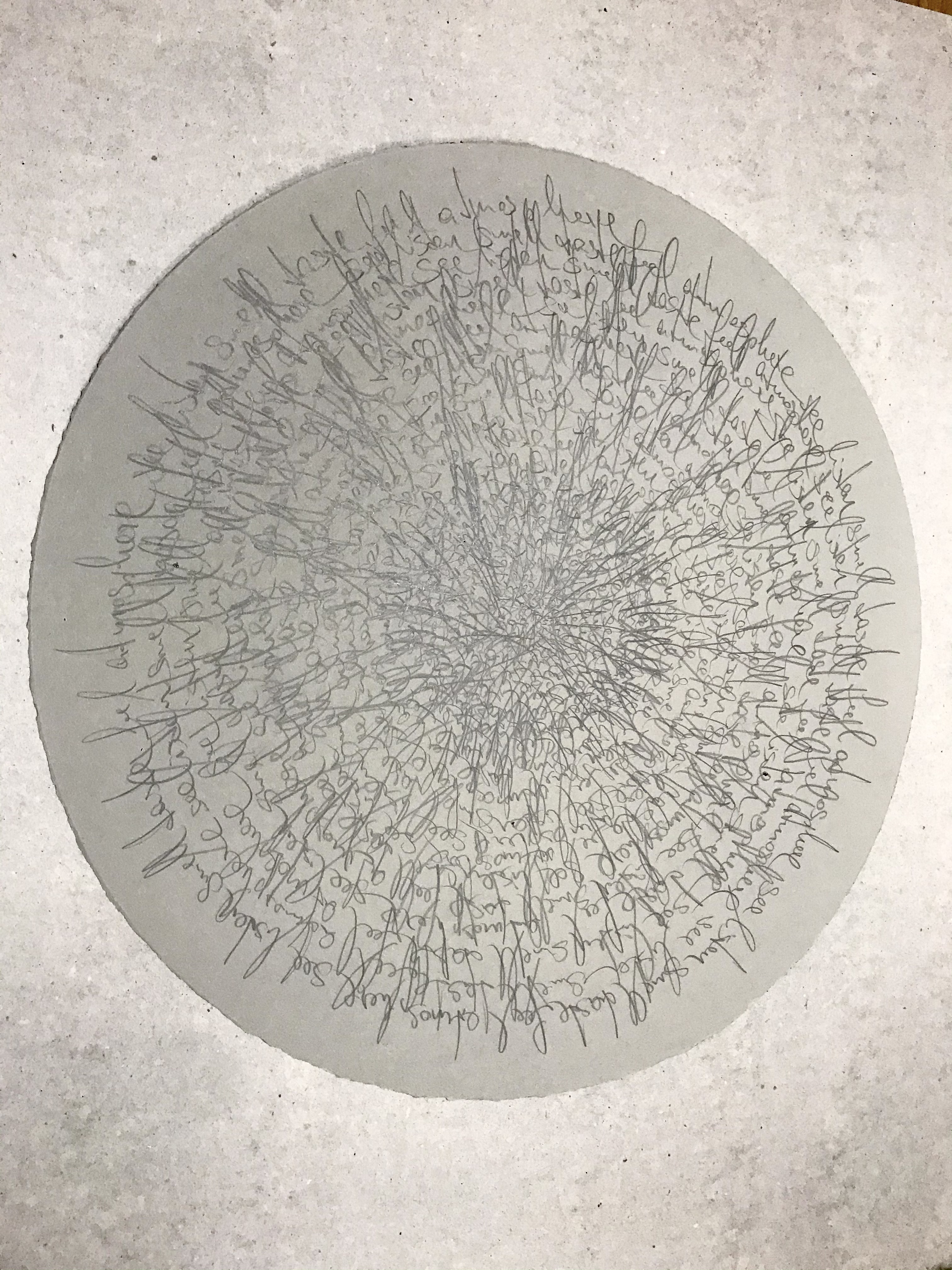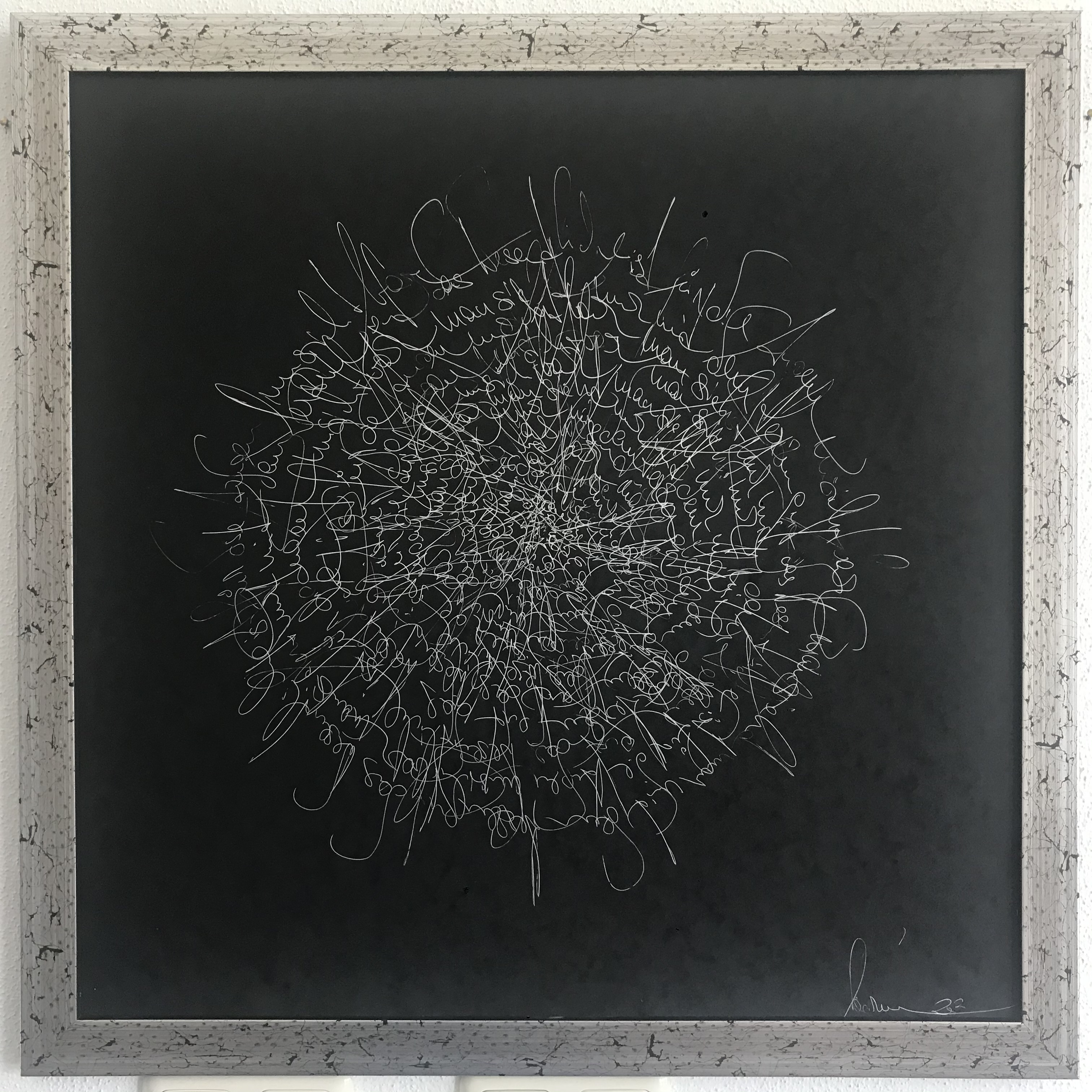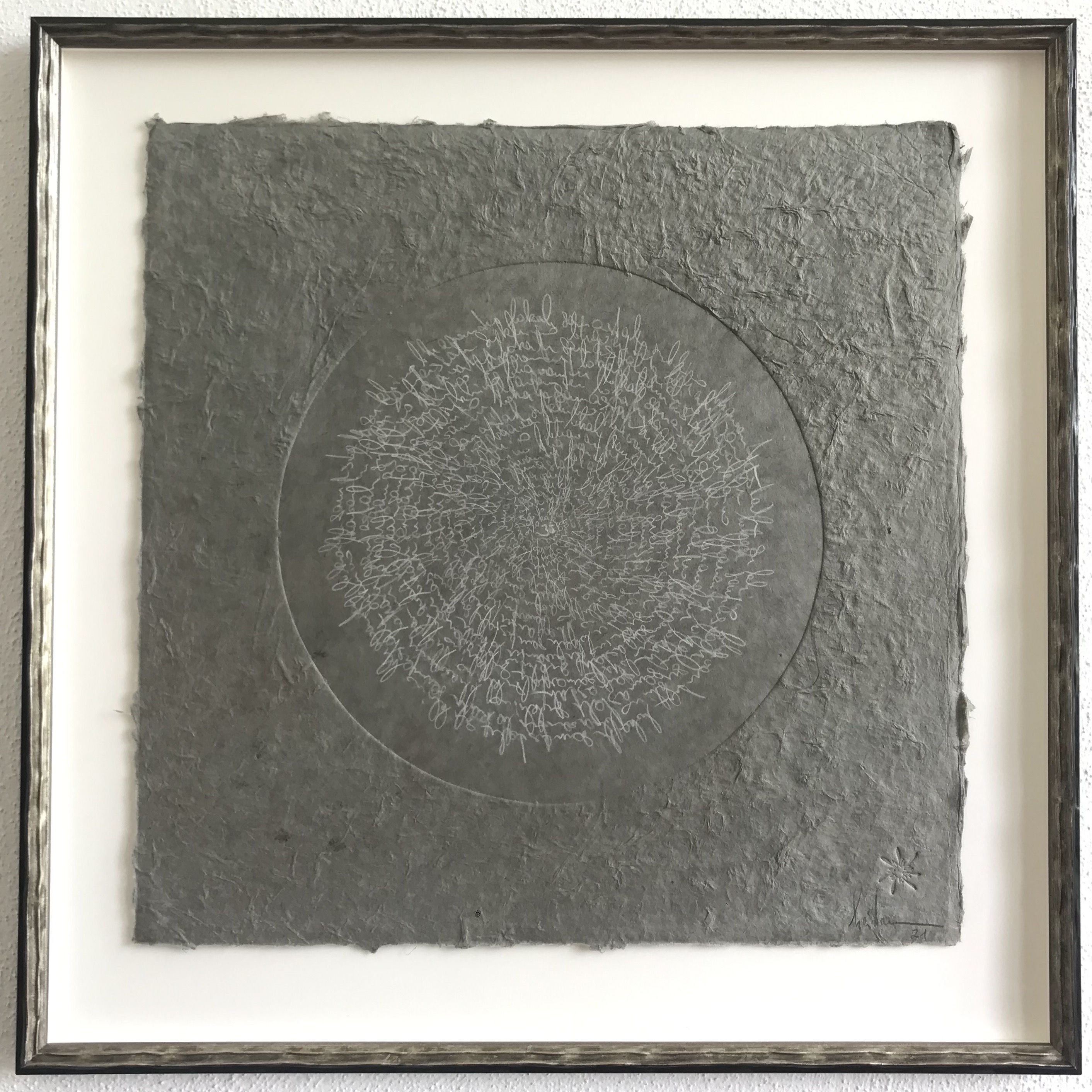 Heidrun wirkt an der Seite von Christian Fuchs in der Buchbinderei Fuchs als Druckwerkstattleiterin und Kreativtrainerin mit Schwerpunkt Malen und Gestalten nach therapeutischen Ansätzen. Durch die Begeisterung zur Handschrift lässt sie ganz besondere Schriftbilder entstehen. Wie ein Mantra wiederholen sich die Worte, bauen ein Energiefeld auf, verschmelzen mit dem handgeschöpften Nepal-Büttenpapier zu einem Gesamt-Kunstwerk. Die sorgfältig ausgesuchten Botschaften/ Gedichte/ Wünsche werden handschriftlich in einen optisch perfekten Kreis geformt - Kreisformen die die Künstlerin schon lange faszinieren.