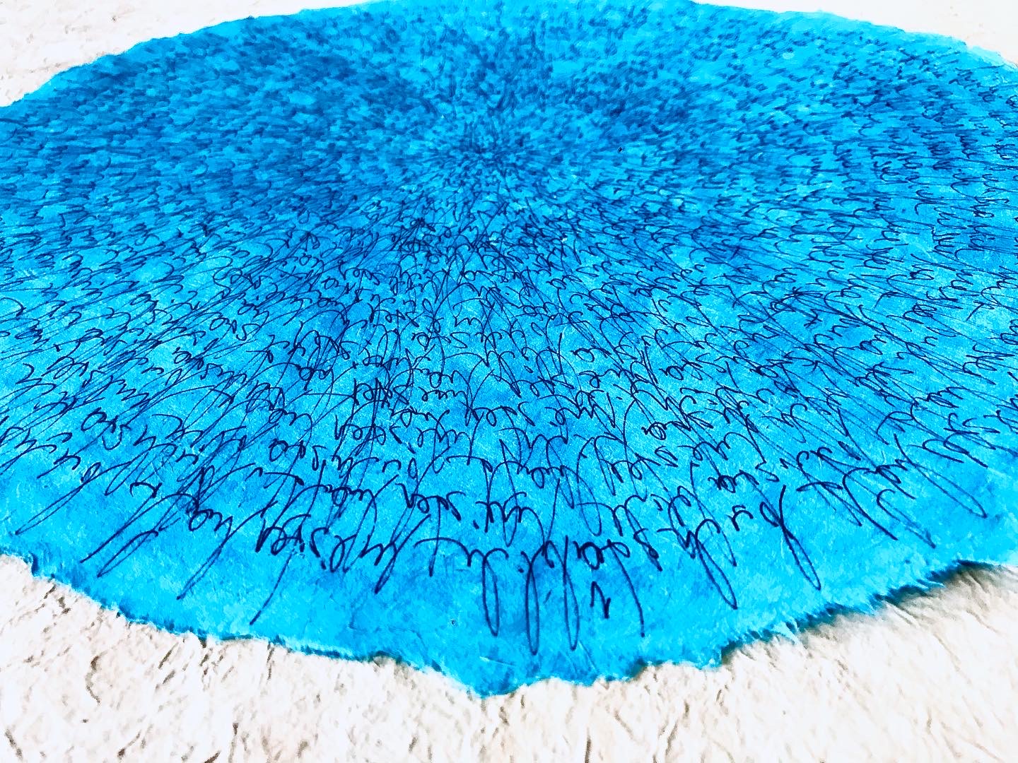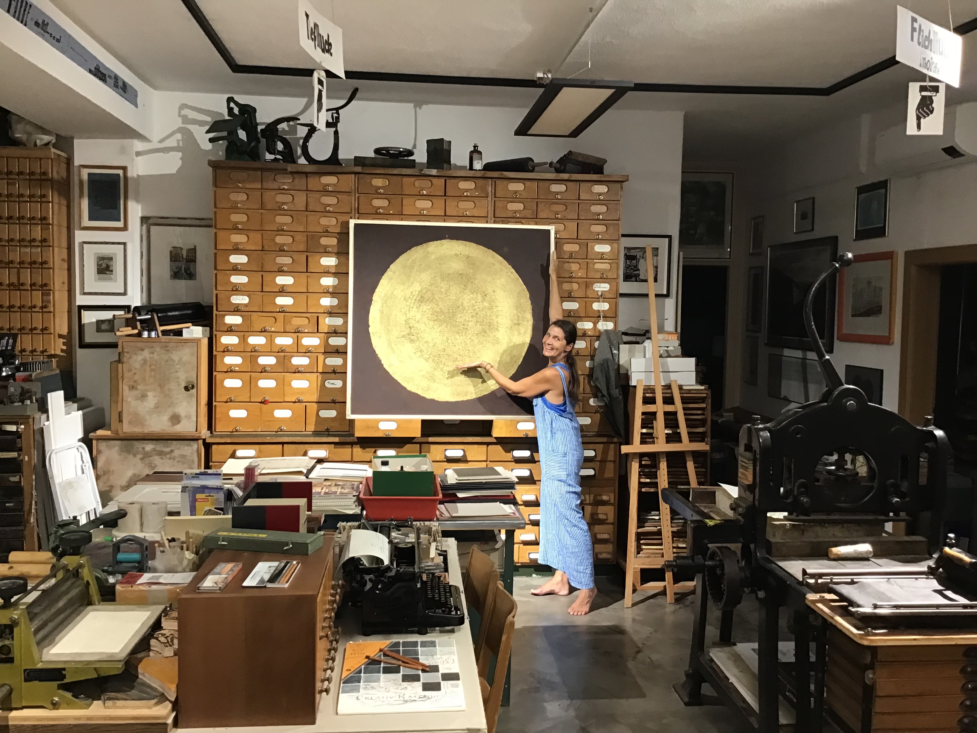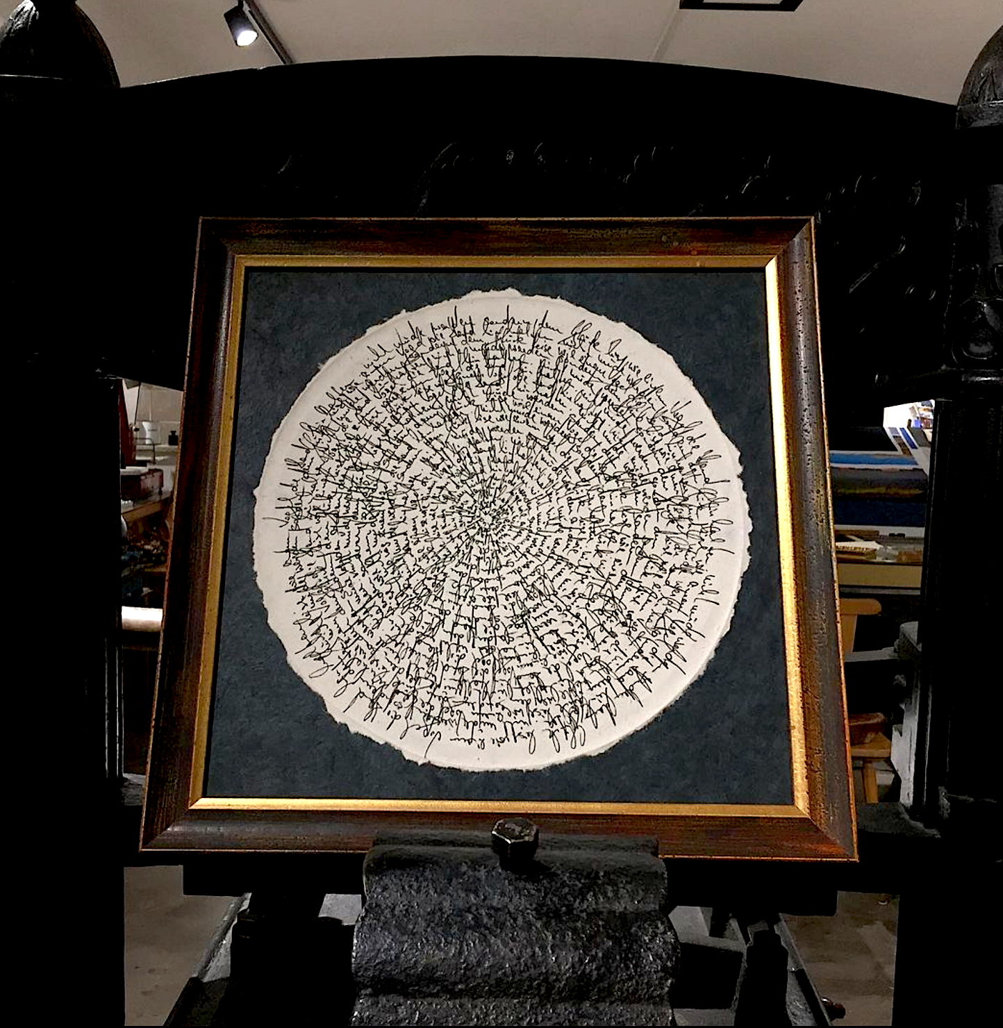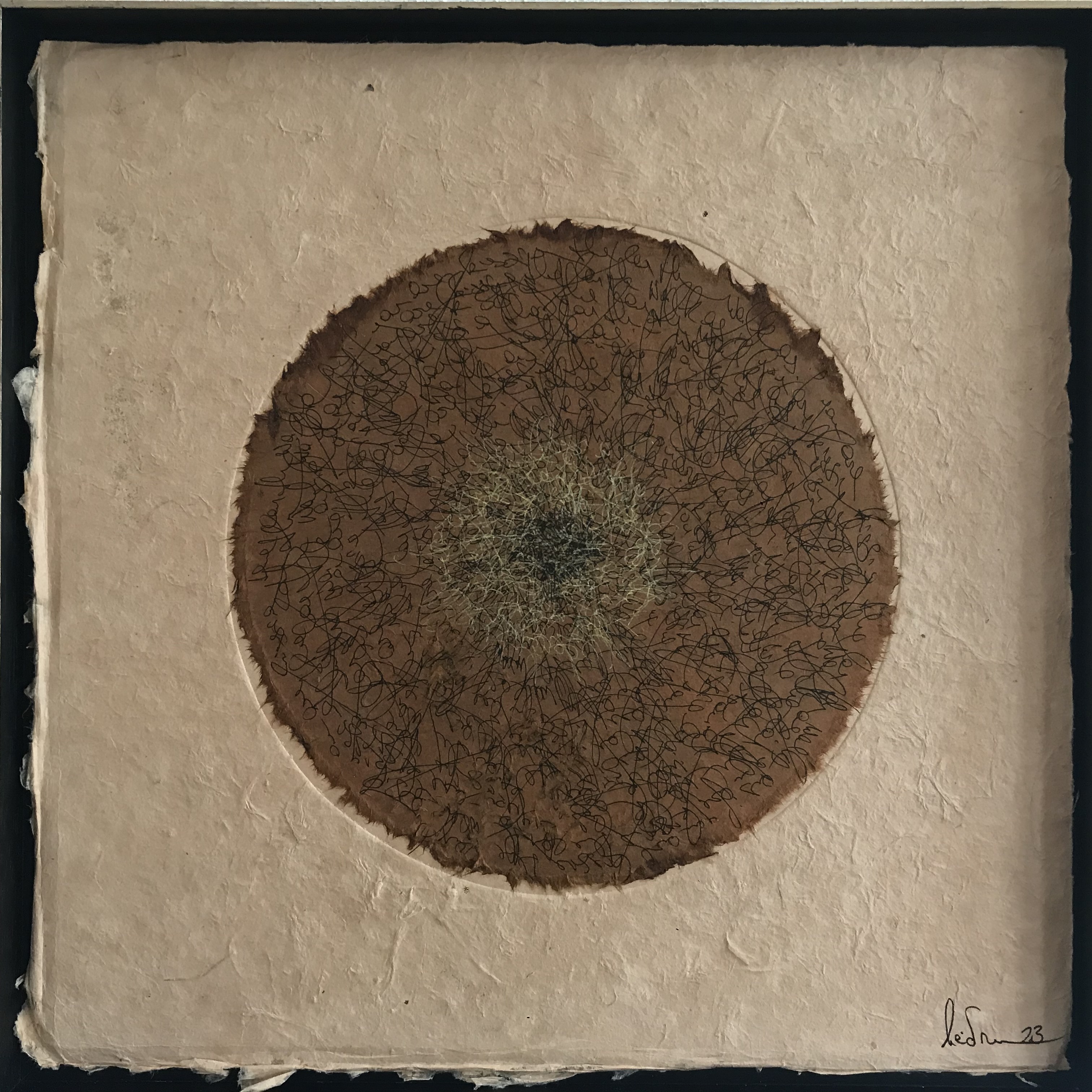 Heidrun wirkt an der Seite von Christian Fuchs in der Buchbinderei Fuchs als Druckwerkstattleiterin und Kreativtrainerin mit Schwerpunkt Malen und Gestalten nach therapeutischen Ansätzen. Durch die Begeisterung zur Handschrift lässt sie ganz besondere Schriftbilder entstehen. Wie ein Mantra wiederholen sich die Worte, bauen ein Energiefeld auf, verschmelzen mit dem handgeschöpften Nepal-Büttenpapier zu einem Gesamt-Kunstwerk. Die sorgfältig ausgesuchten Botschaften/ Gedichte/ Wünsche werden handschriftlich in einen optisch perfekten Kreis geformt - Kreisformen die die Künstlerin schon lange faszinieren.